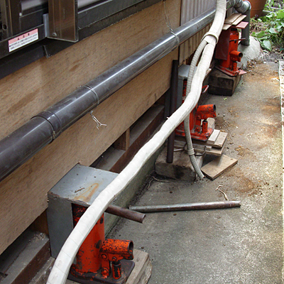 22センチくらい傾いていました、車のジャッキを利用しています、入居中の工事でご協力感謝です。